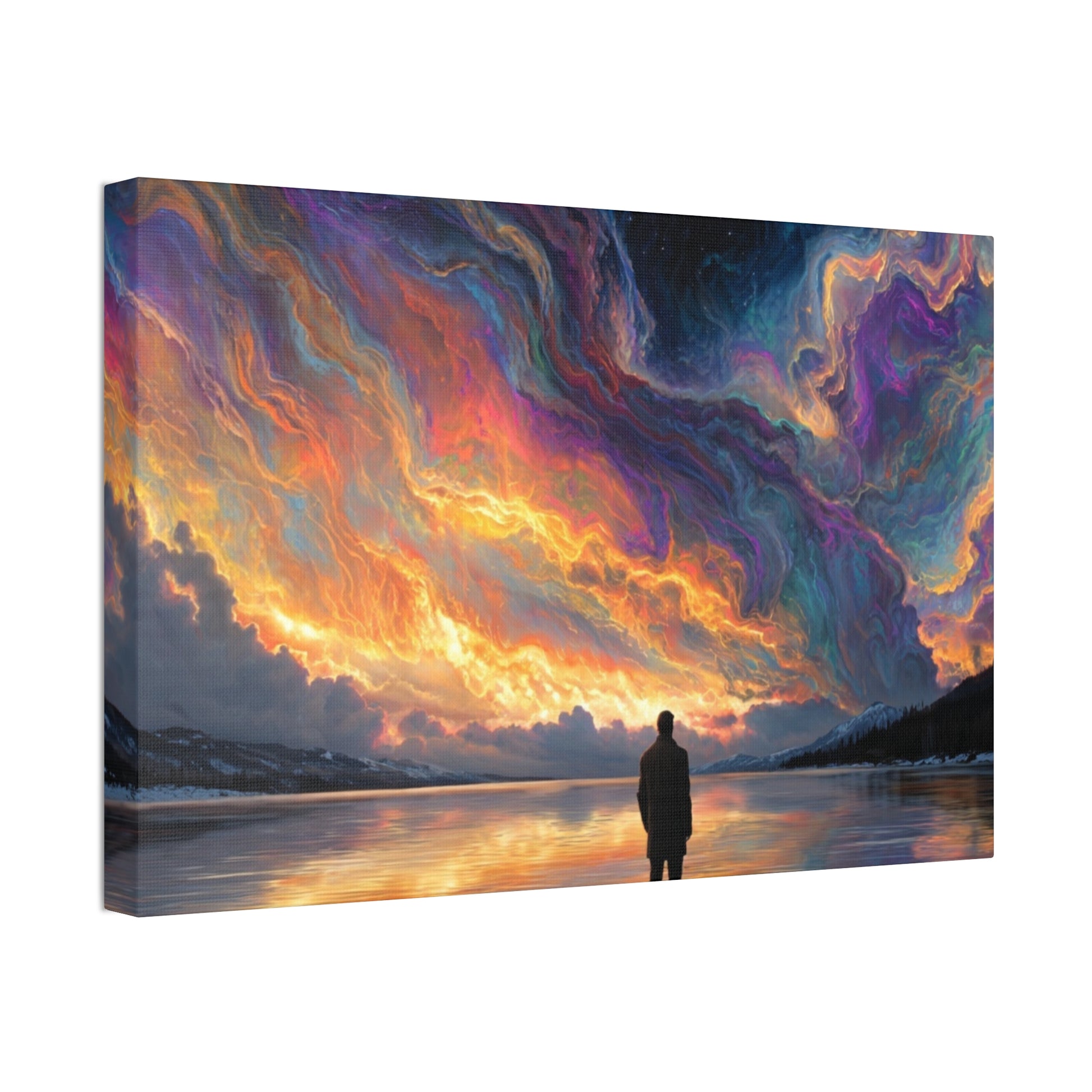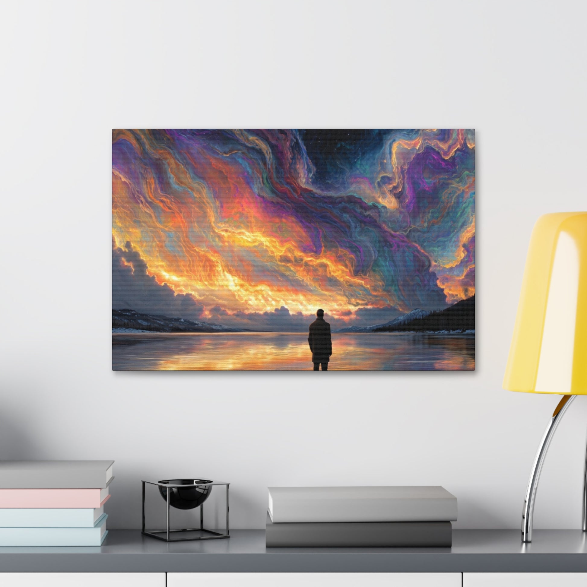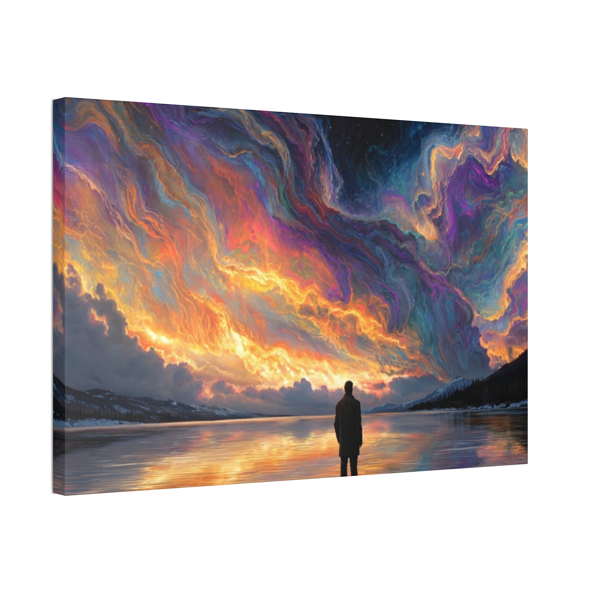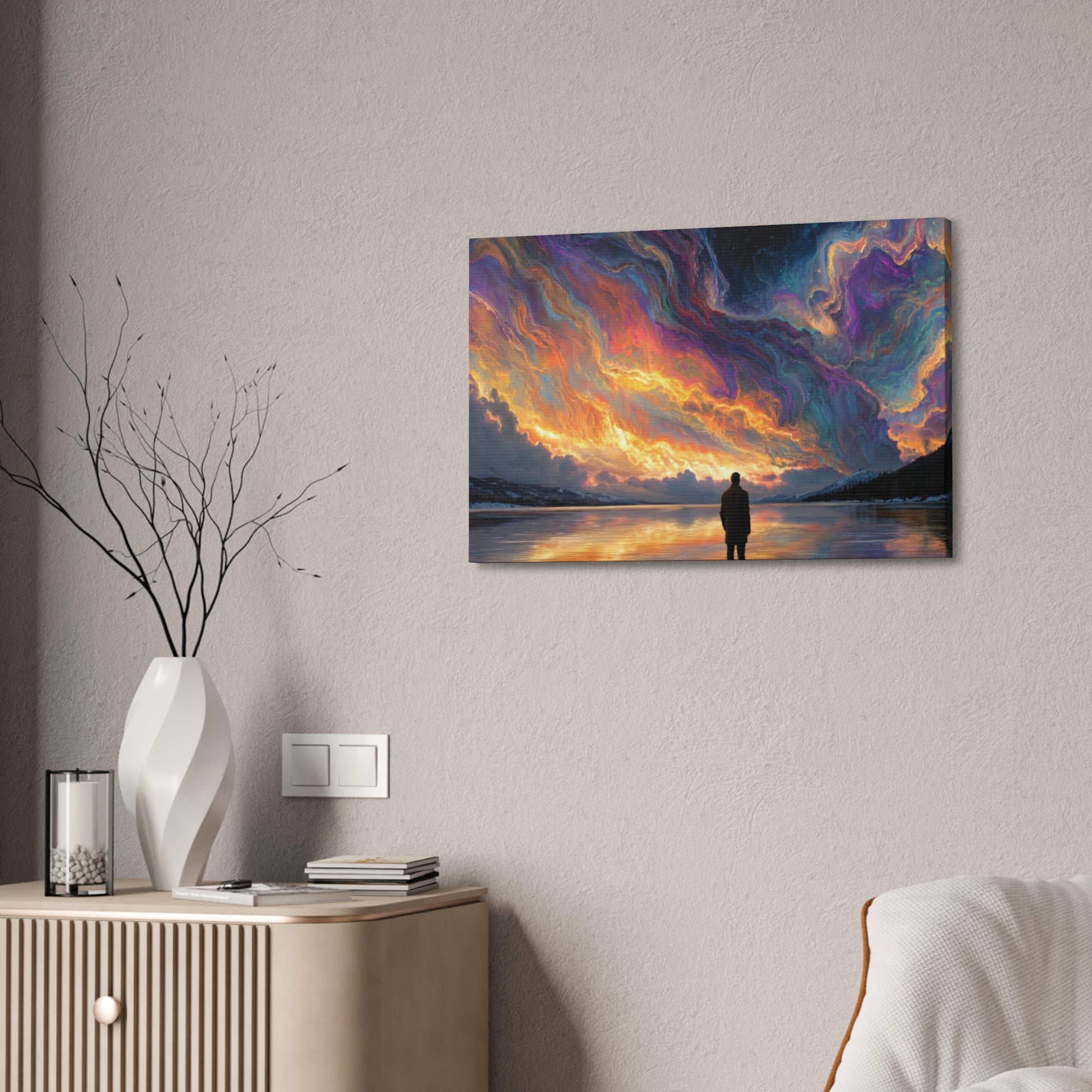 A hand-stretched pine-framed canvas that brings cinematic motion and quiet resolve to your walls. The semi-gloss polyester surface holds vivid, painterly color — the drifting red cape and cool, muted background keep pulling your eye deeper into the scene. Lightweight but solid, it arrives ready to hang with mounting hardware installed and a small QR code on the back for care or provenance. Hung above a sofa, in a hallway, or in a studio, this stretched canvas reads like a still from a story: wind, movement, and a moment held steady.