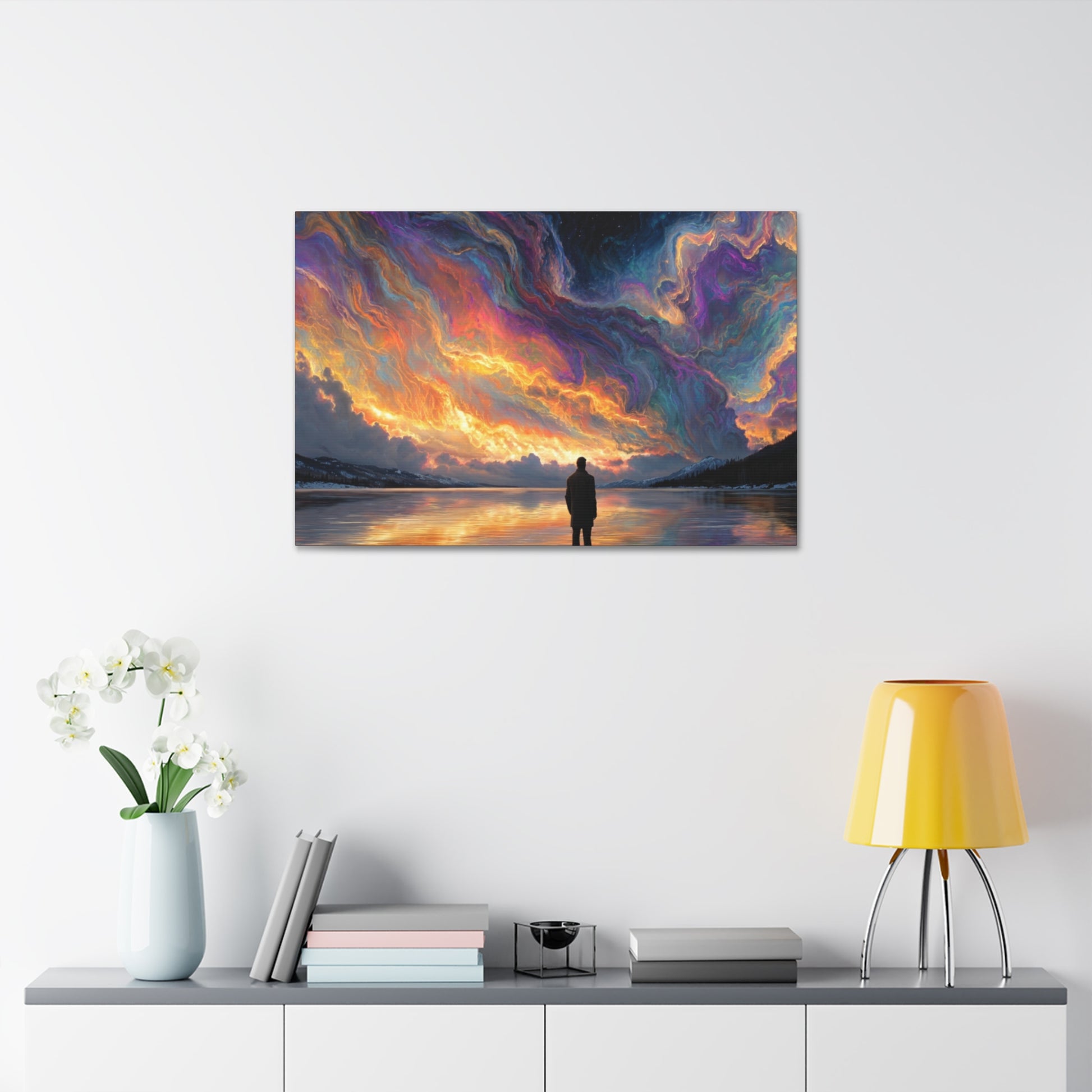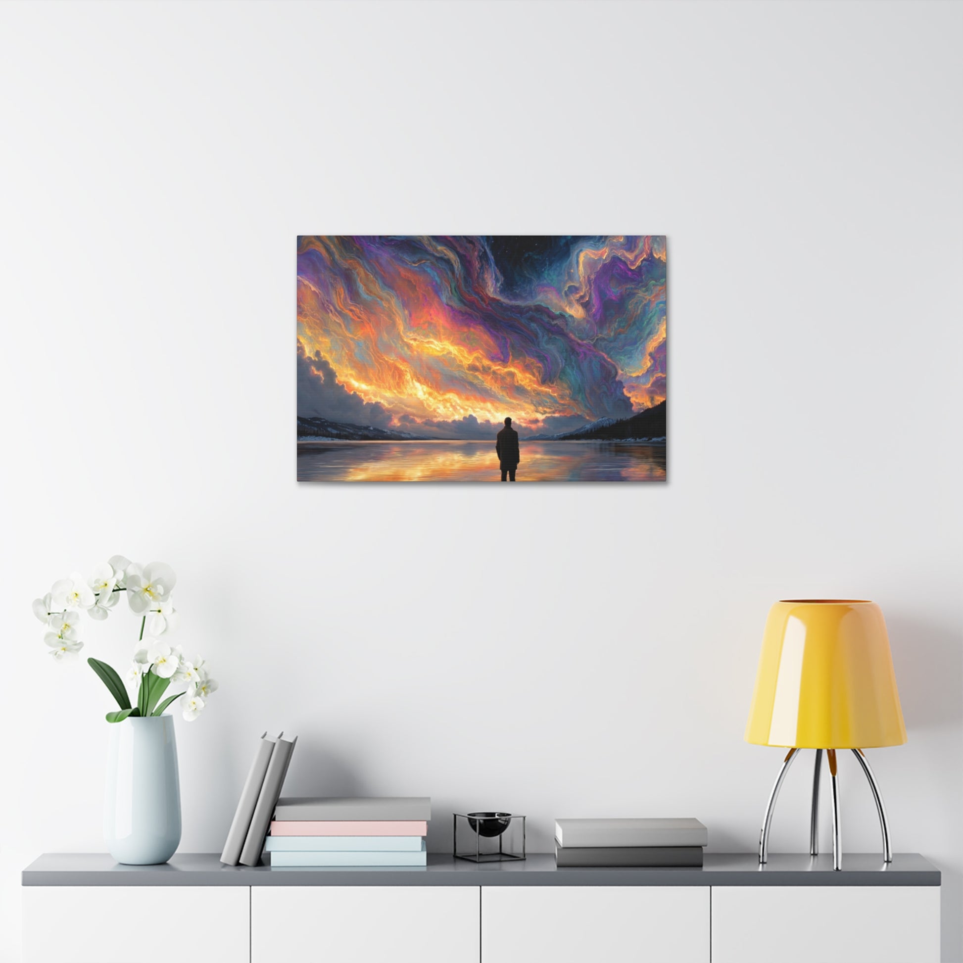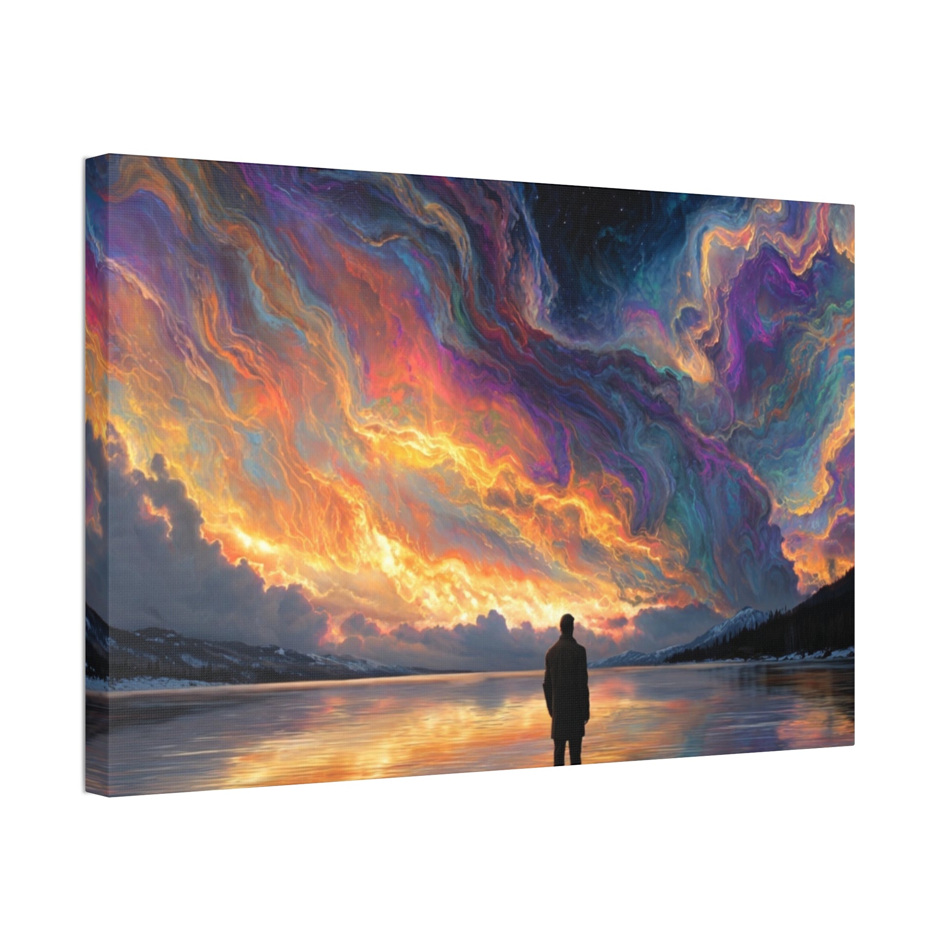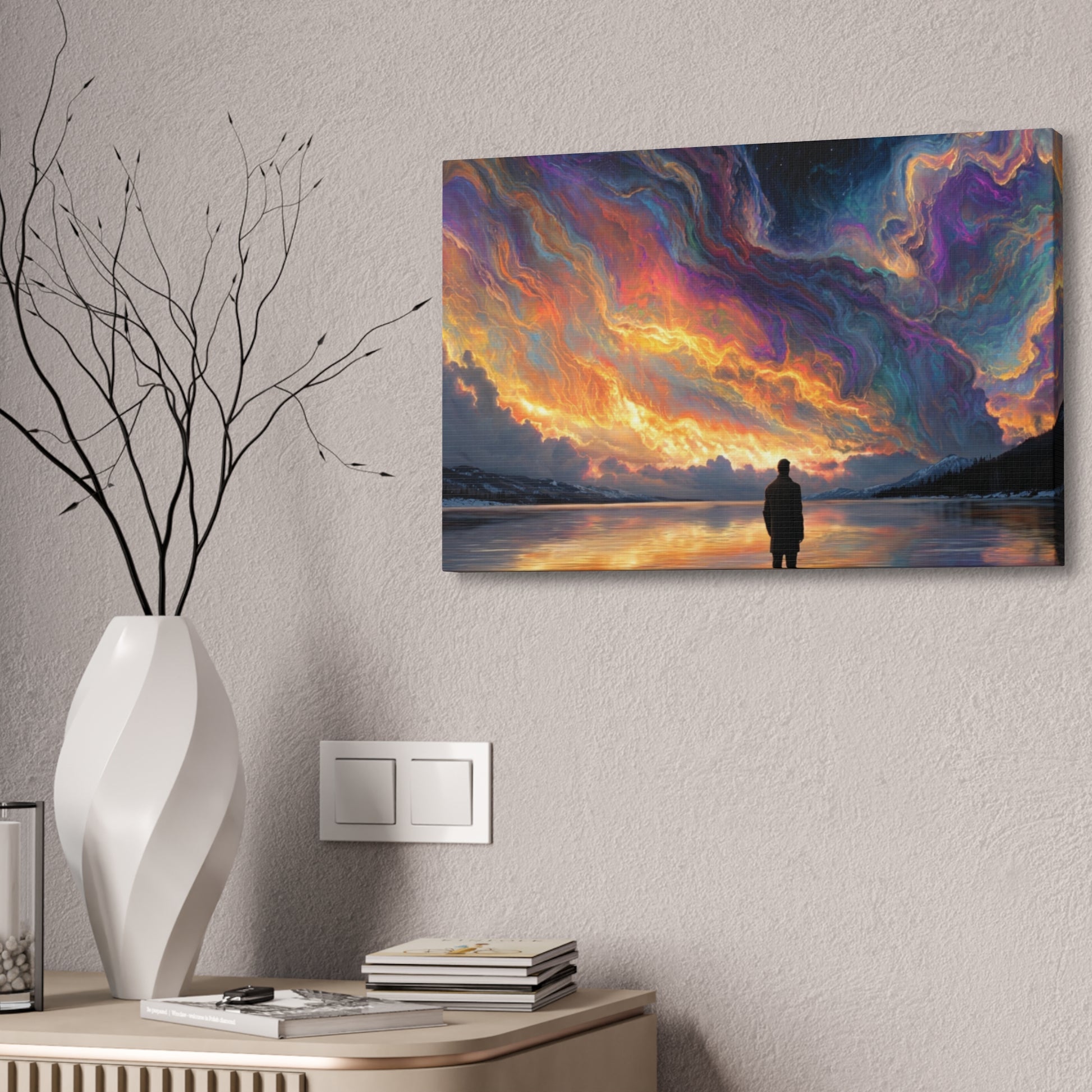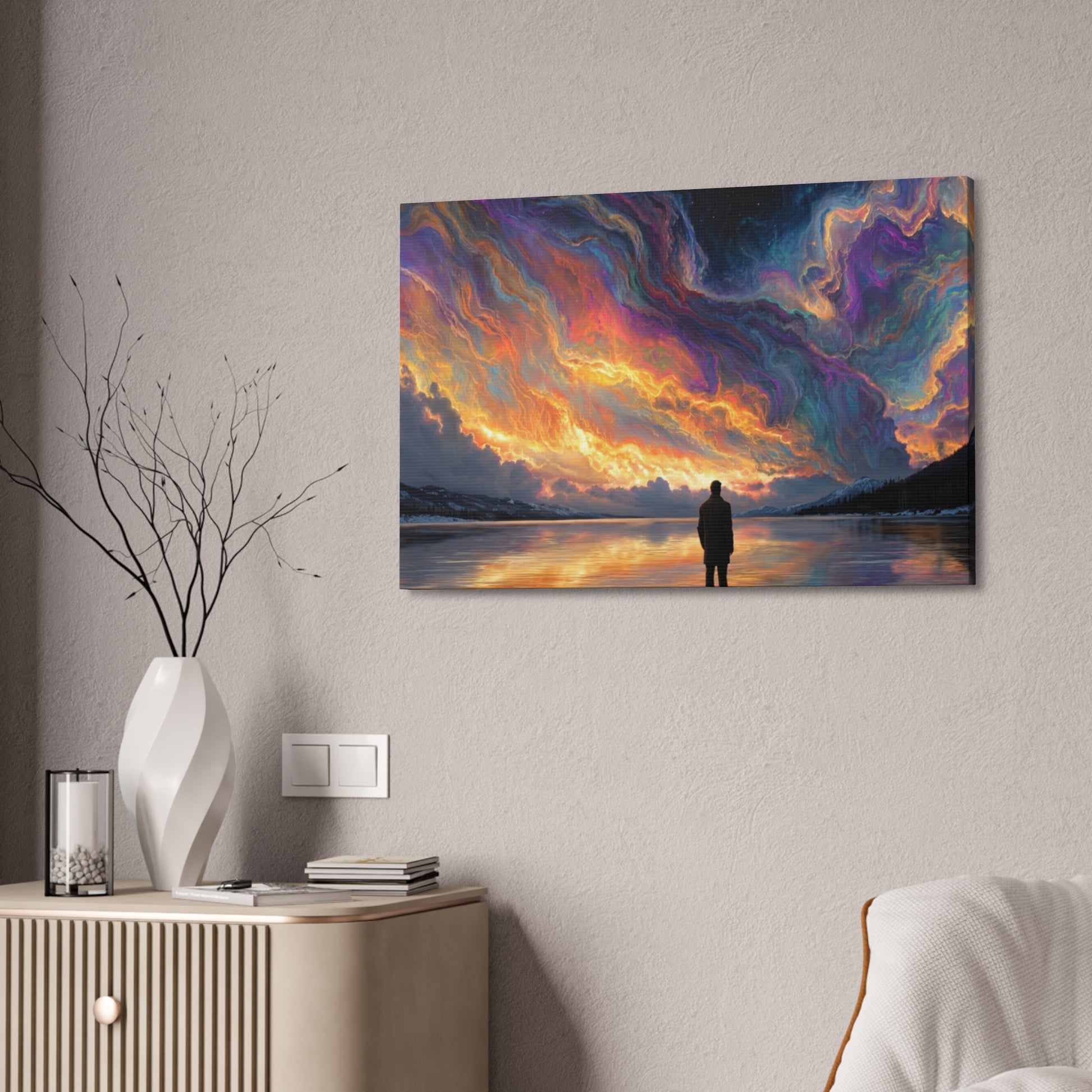A hand-stretched pine-framed canvas that brings cinematic motion and quiet resolve to your walls. The semi-gloss polyester surface holds vivid, painterly color — the drifting red cape and cool, muted background keep pulling your eye deeper into the scene. Lightweight but solid, it arrives ready to hang with mounting hardware installed and a small QR code on the back for care or provenance. Hung above a sofa, in a hallway, or in a studio, this stretched canvas reads like a still from a story: wind, movement, and a moment held steady.